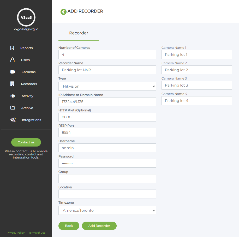 Enter the NVR/DVR parameters, including the number of cameras connected to the recorder, the preferred name of the recorder, camera names, public IP address and ports, and the recorder’s credentials.