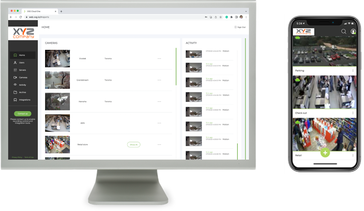 VXG - the leading video surveillance technology expert offers a Cloud Video Surveillance Platform for SaaS companies, video surveillance as a service (VSaaS) and video management software (VMS) companies, telecom companies, central monitoring stations (CMS), IP cameras, DVR and NVR vendors, video analytics (VA) and artificial intelligence (AI) companies, and video surveillance integrators.