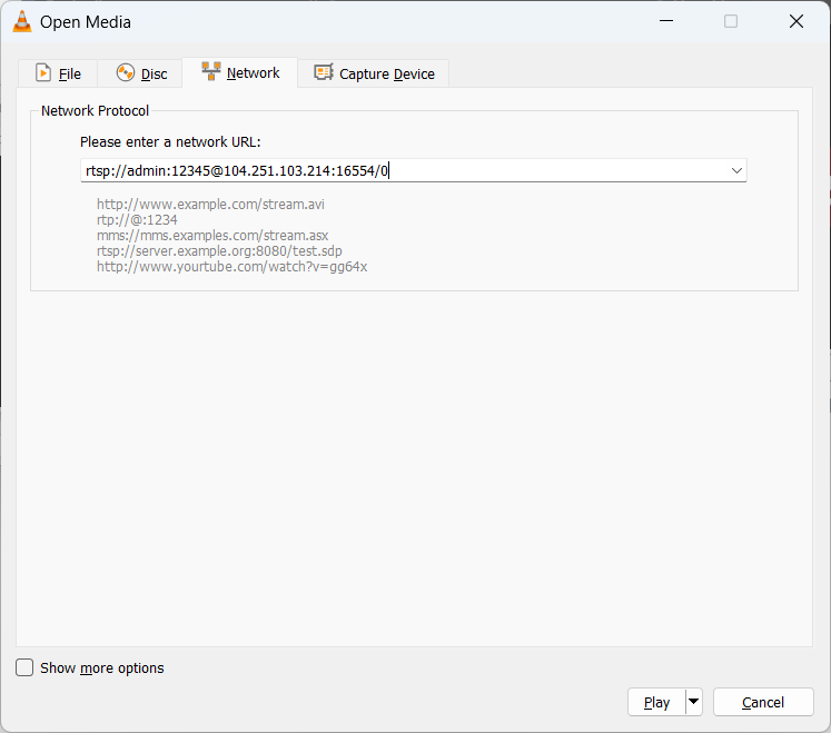 3.3 Use the above URL in VLC player (Media > Open Network Stream) or ffplay.