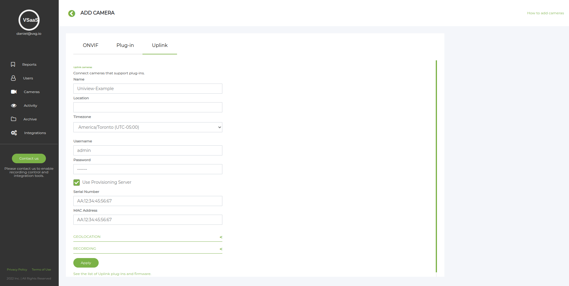 Please put the MAC Address in BOTH the Serial Number and MAC Address fields. The MAC address must be capitalized.Log into your camera’s admin page and navigate to System > Maintenance