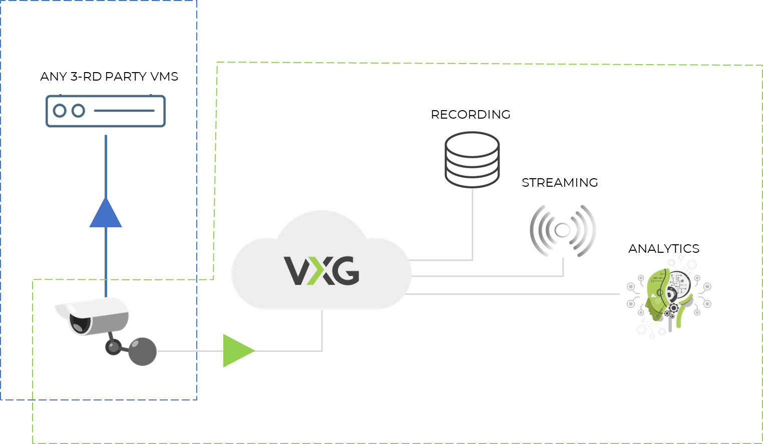 At the same time, VXG can work in parallel with any 3-rd party VMS being just focused on providing additional cloud services such as cloud recording, streaming, or analytics. VXG connects to cameras directly and not through 3-rd party VMS, making the solution independent from 3-rd party VMS.