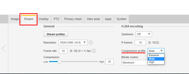 Browsers don’t support WebRTC video with a high compression profile, so you need to check that the IP camera is using either a Baseline or Main compression profile. For example, on Axis camera go to Settings > Stream > H.264 encoding > Compression profile: